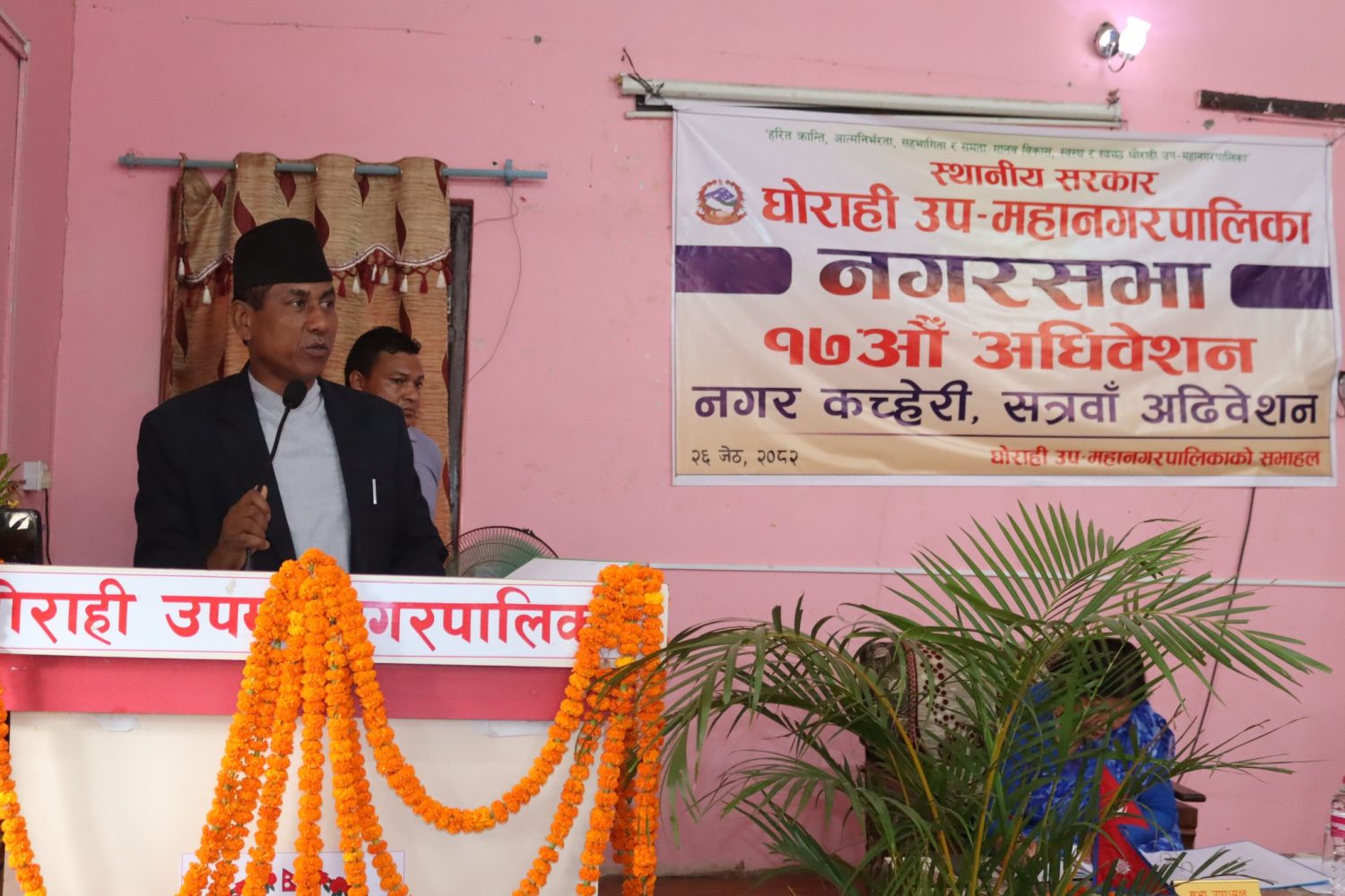 दाङ, २६ जेठ । दाङको घोराही उपमहानगरपालिकाकाले आगामी वर्षको नीति तथा कार्यक्रम सार्वजनिक गरेको छ । १७ औं नगरसभामा आगामी आर्थिक वर्ष २०८२/०८३ का लागि नीति तथा कार्यक्र सार्वजनिक गर्दै नगर प्रमुख नरुलाल चौधरीले कृषियोग्य भूमिको उपयोग, सिँचाइ, बीउ सुधार, पशुपालन, माछापालन, प्राङ्गारिक खेती, बजार पहुँच, प्रविधि तथा रोजगार सिर्जनासम्मका विषयमा केन्द्रित रहने बताउनुभयो ।